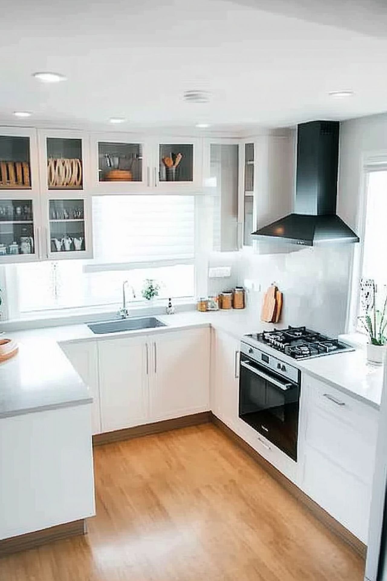 In a small U-shaped kitchen, choose finishes that make it feel bigger. Handleless cabinets help keep things organized and open. For a stylish look, use glass-front cabinets to let light in.