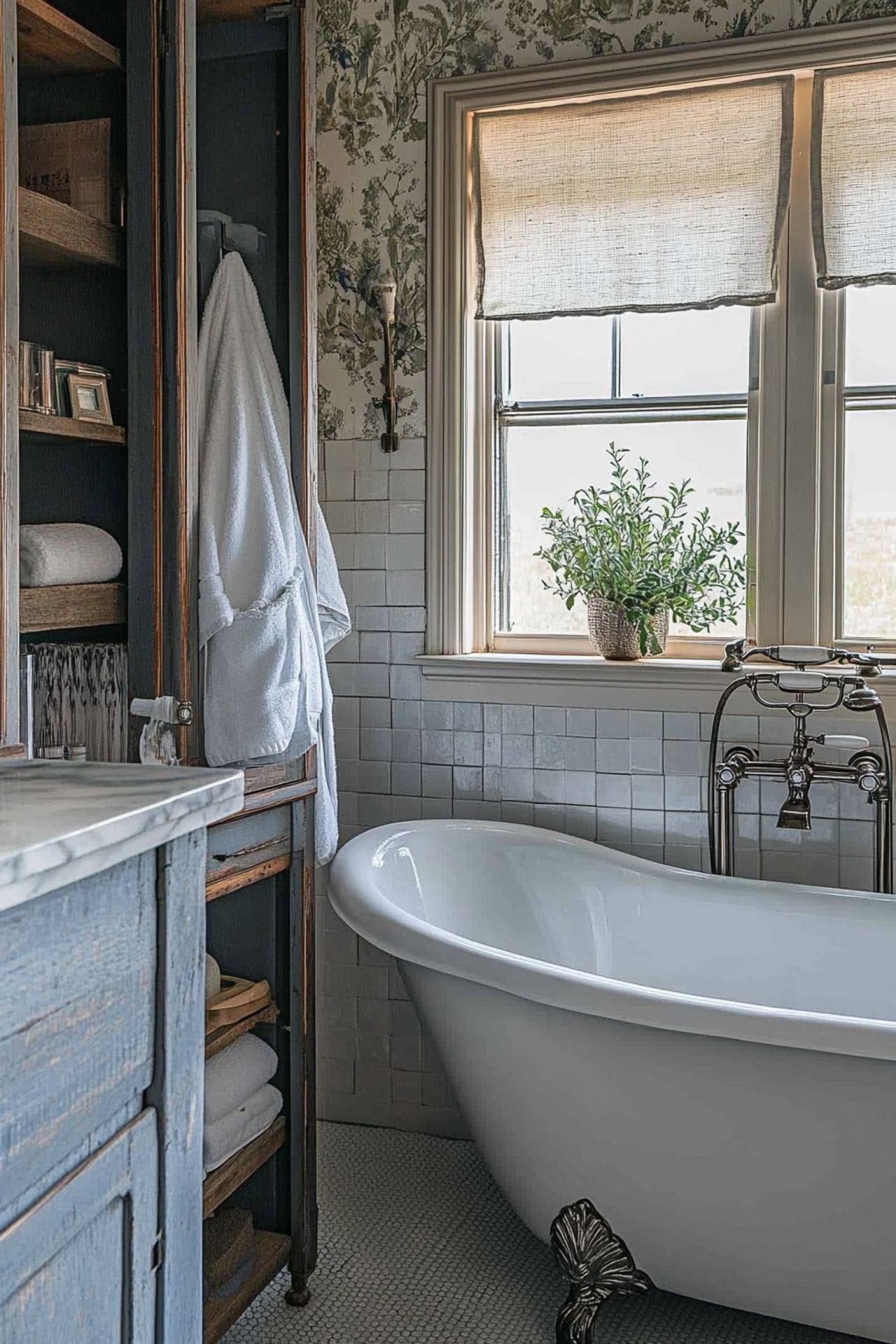 Antique cabinets and vintage containers add charm and function. They help keep your bathroom organized.