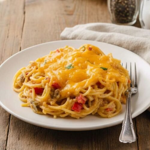 One of the biggest perks of chicken spaghetti is how well it lends itself to meal prep. Assemble the dish in advance and refrigerate it until you’re ready to bake. Prefer a lighter version? Substitute Greek yogurt for sour cream, or try whole wheat spaghetti for added fiber. For more depth, stir in cream cheese for extra richness.