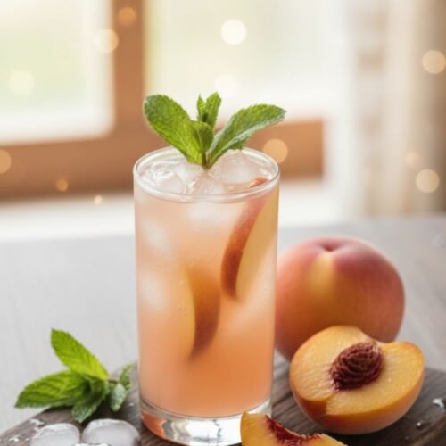 - Garnish with a fresh peach slice, a lime wedge, and a sprig of mint.