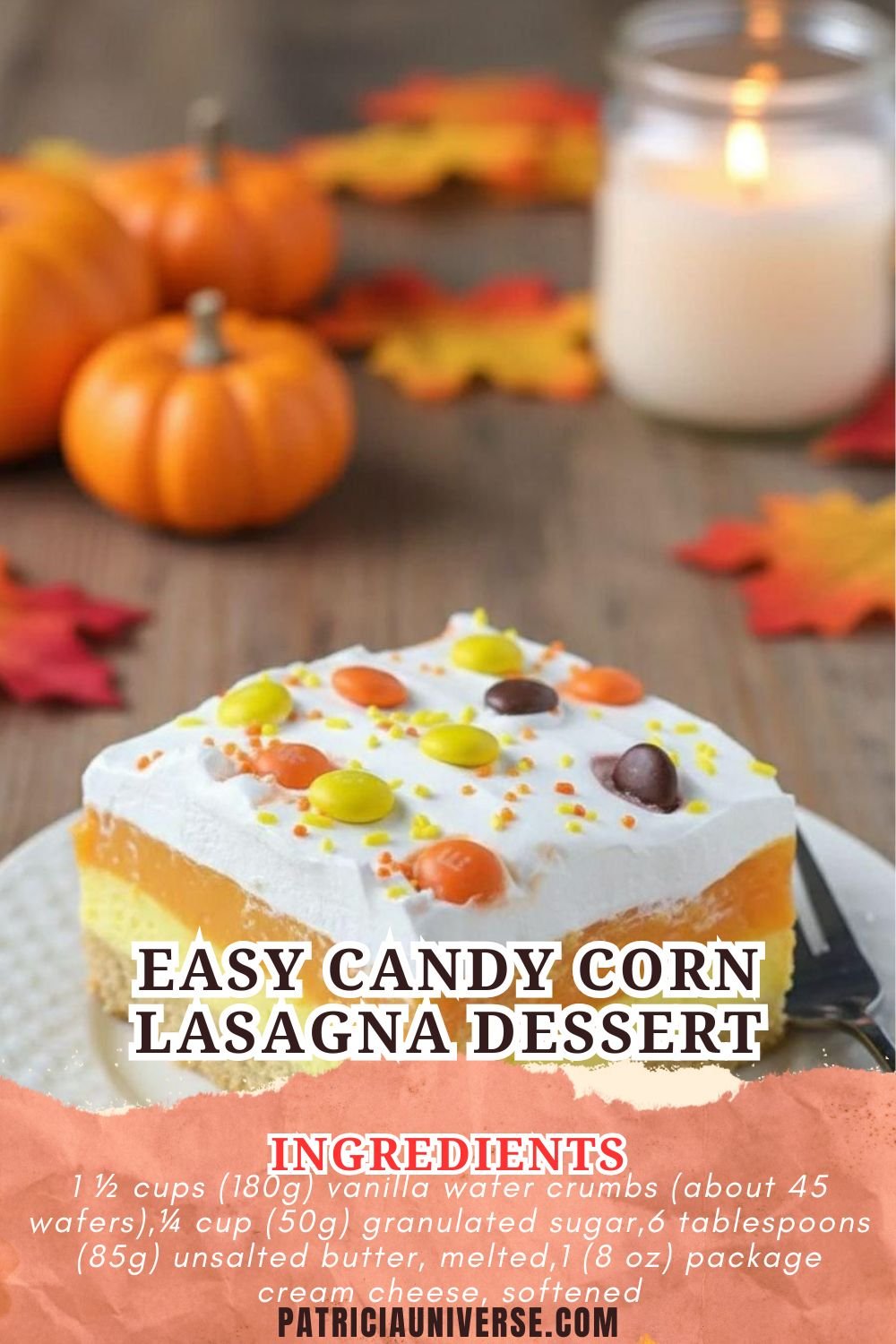 Now that you’re ready to create this beautiful dessert, here is the complete recipe with all the details you need to make it a success. I’ve included all the ingredients and instructions, along with my personal notes to help you along the way. I’d love to see your creations! If you make this Candy Corn Lasagna, be sure to share it with me over at Patricia Universe. Happy baking (or rather, no-baking)!