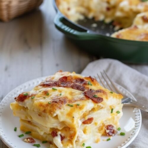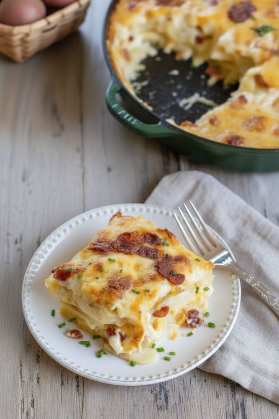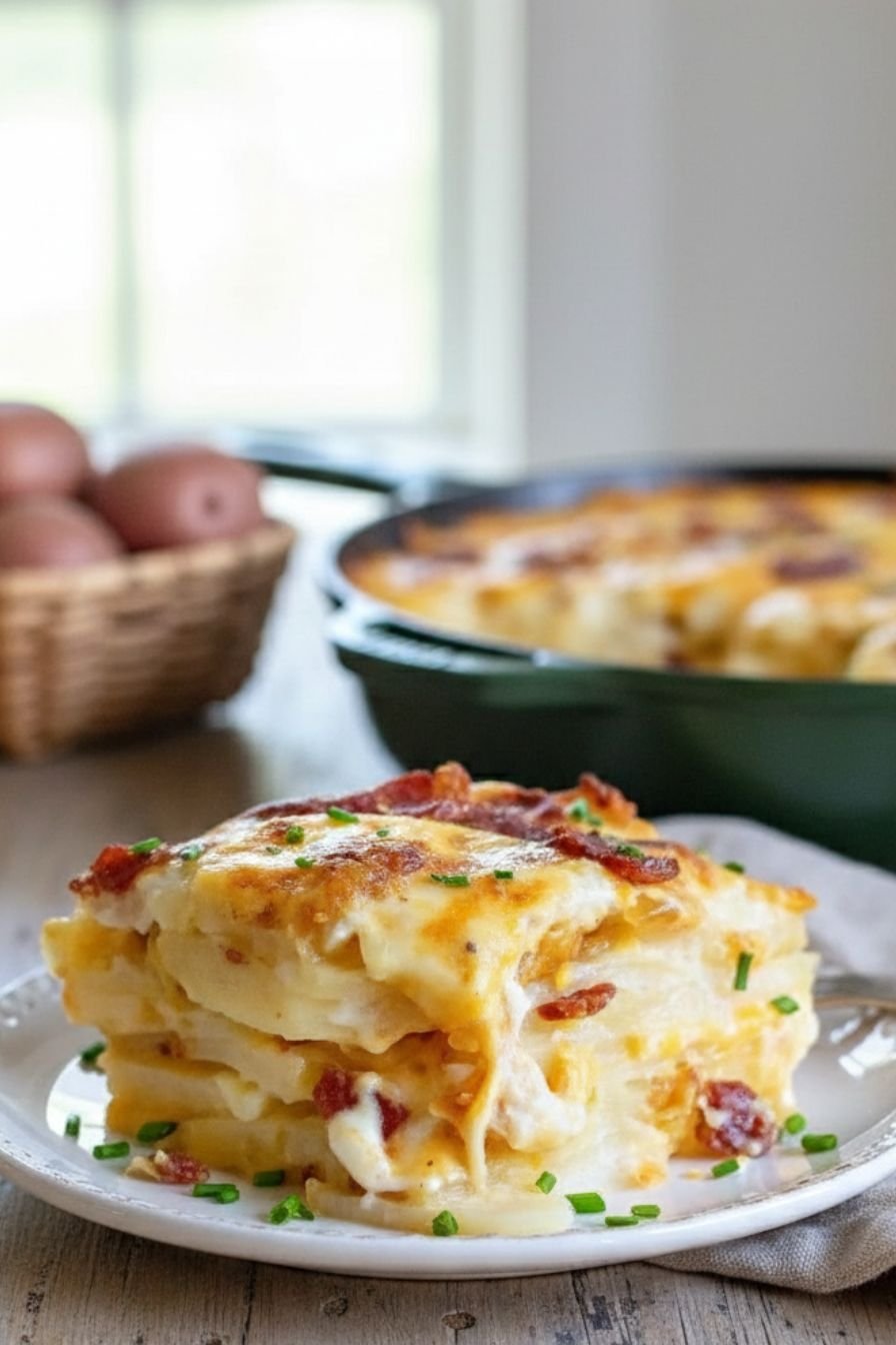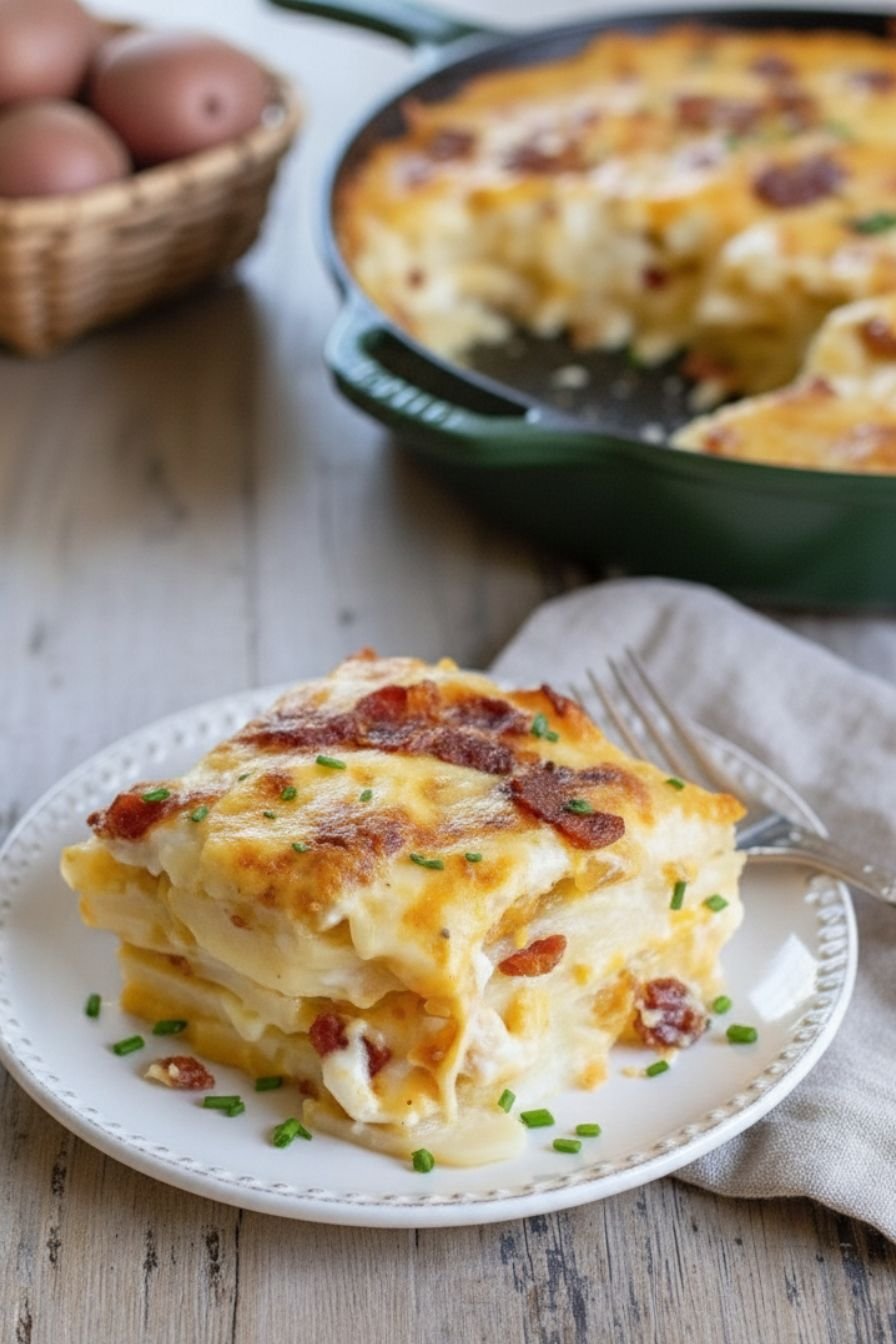 Variations: Add cooked crumbled bacon, diced ham, or sautéed mushrooms between the potato layers for extra flavor. For a touch of heat, sprinkle in red pepper flakes or use pepper Jack cheese in place of some of the cheddar.