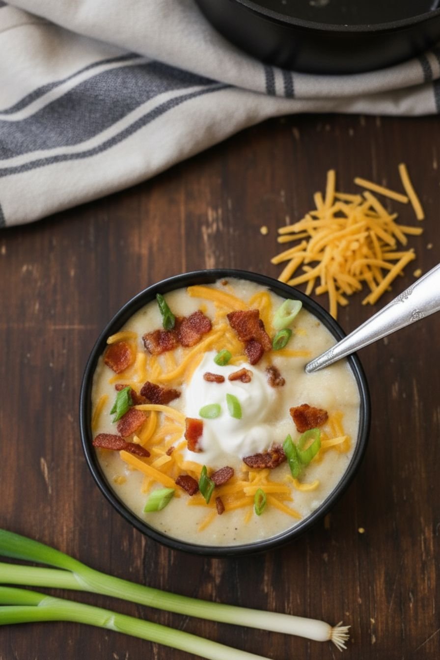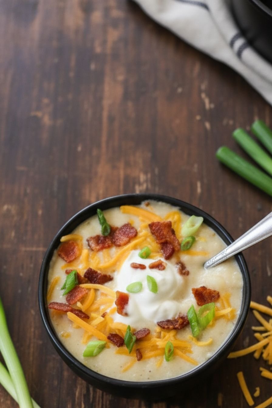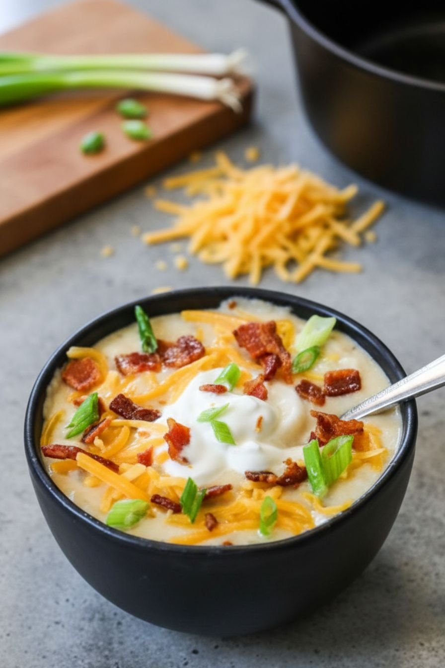 - Serve. Ladle the hot soup into bowls. Top generously with shredded cheddar cheese, a dollop of sour cream, green onions, the reserved crispy bacon, and chives. Serve immediately.