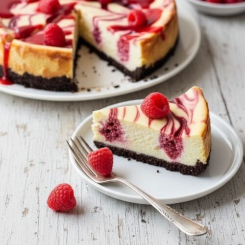 Indulge in this creamy Raspberry Cheesecake, a simple and elegant dessert that combines a graham cracker crust, velvety filling, and sweet raspberry swirl. Perfect for any occasion!