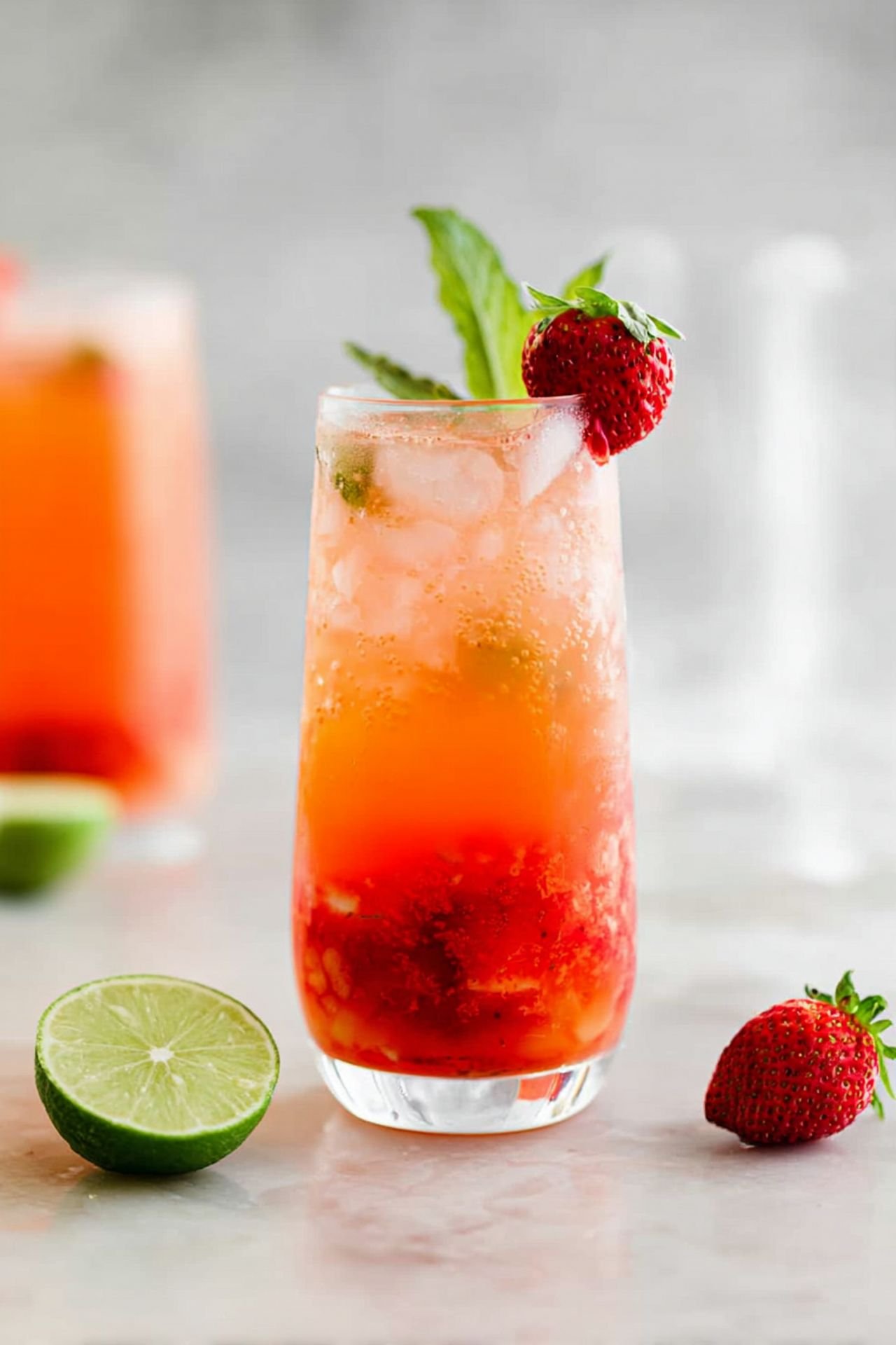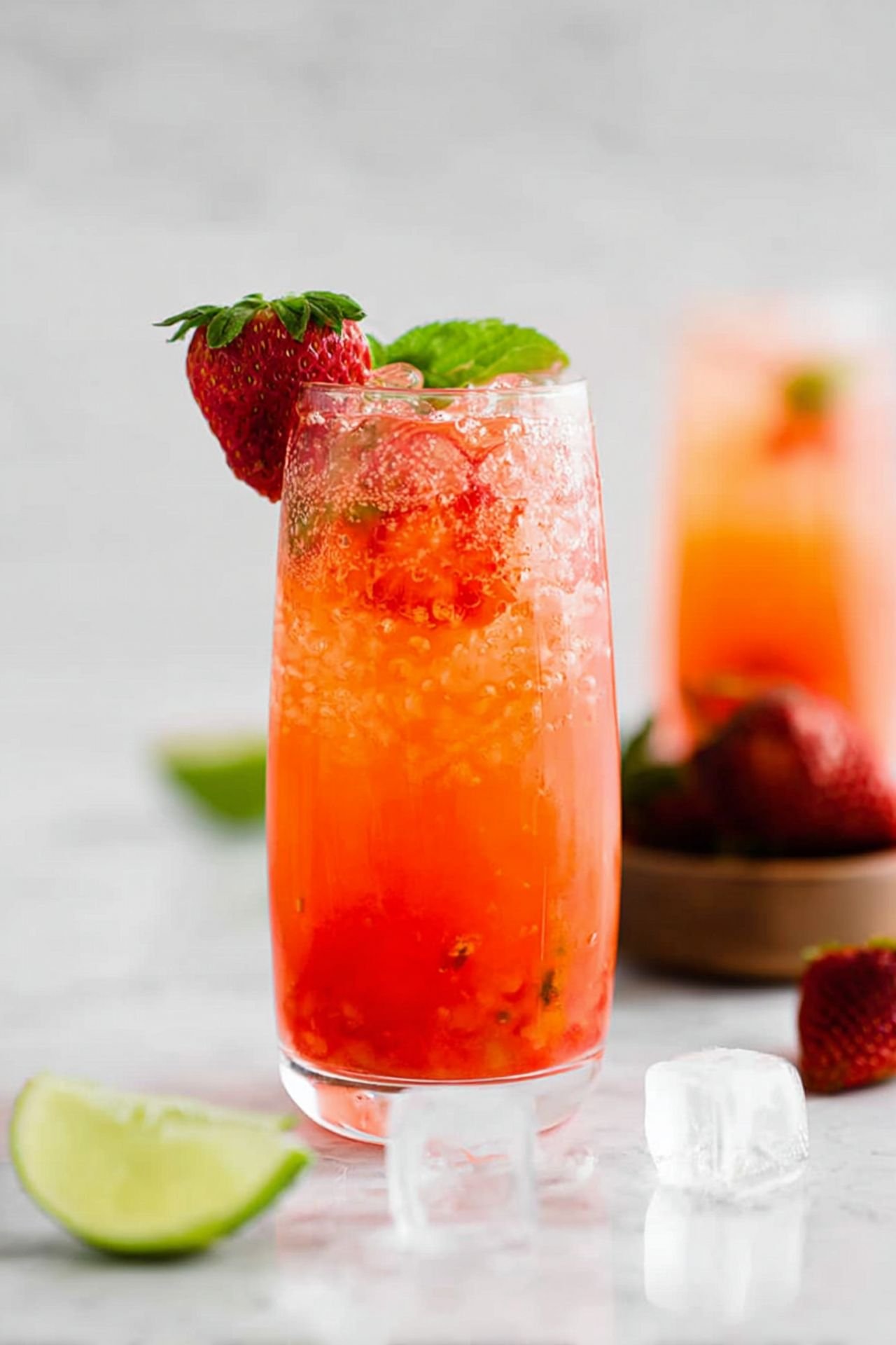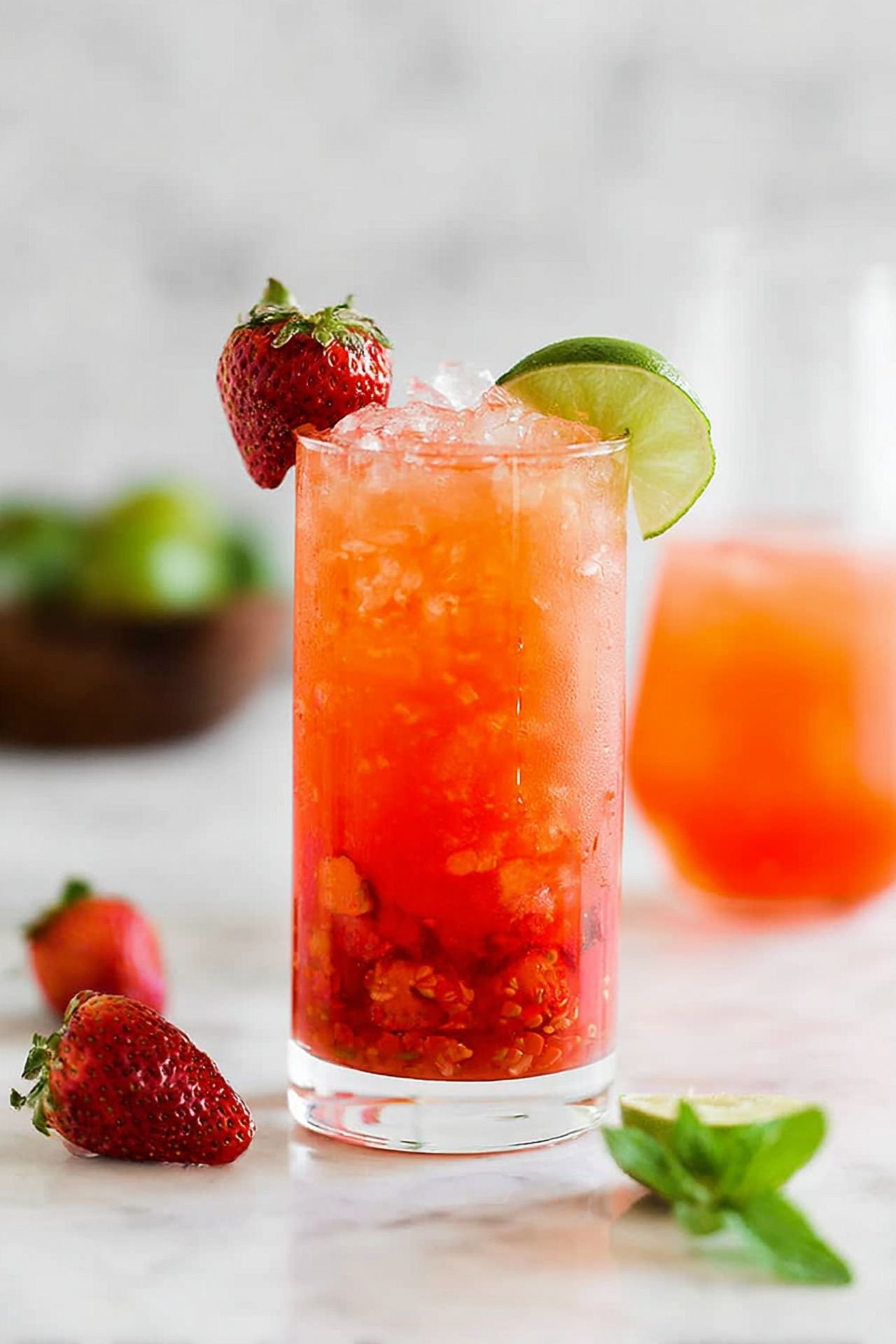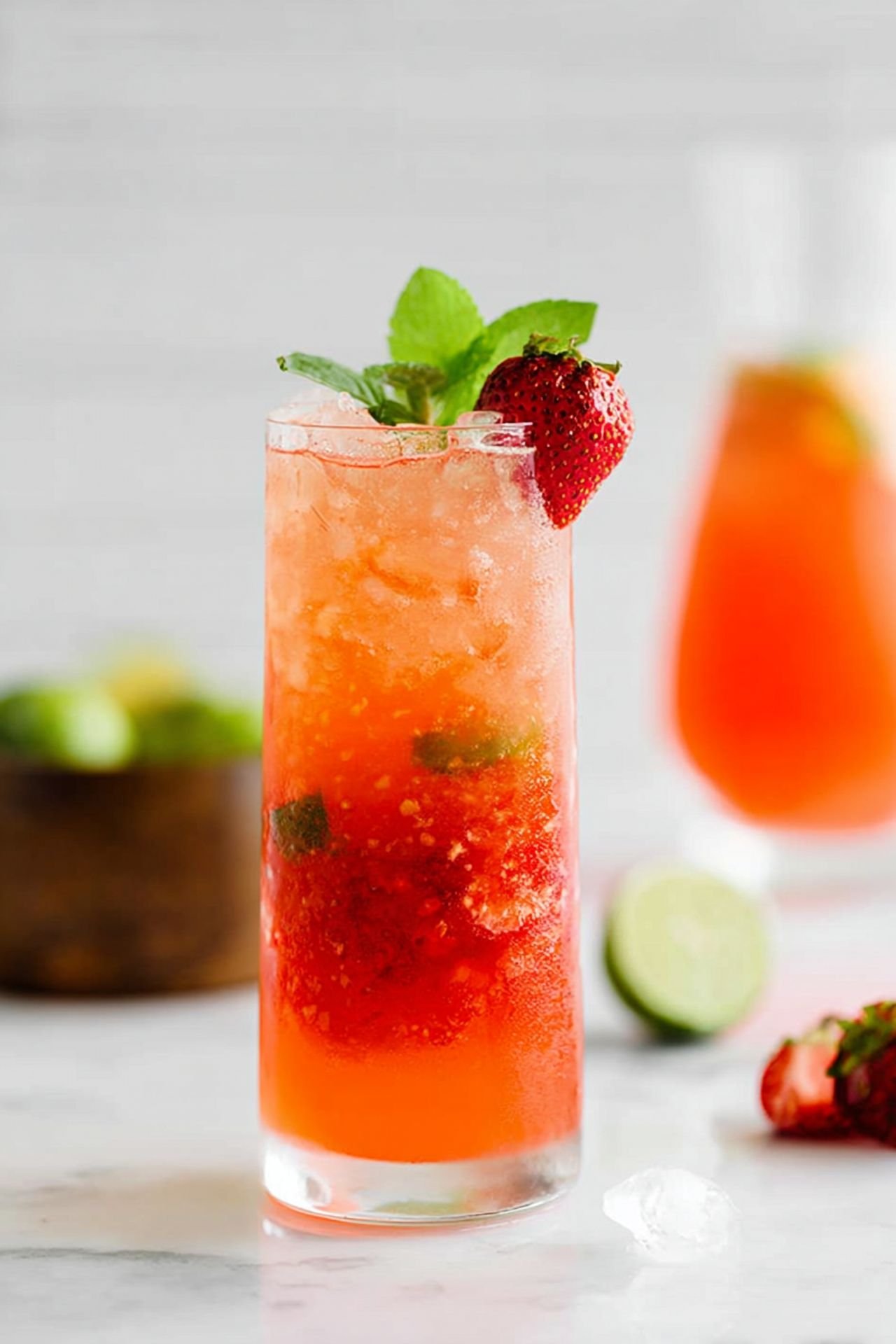 - In a glass, muddle the strawberries, mint leaves, and lime juice until the strawberries are broken down.