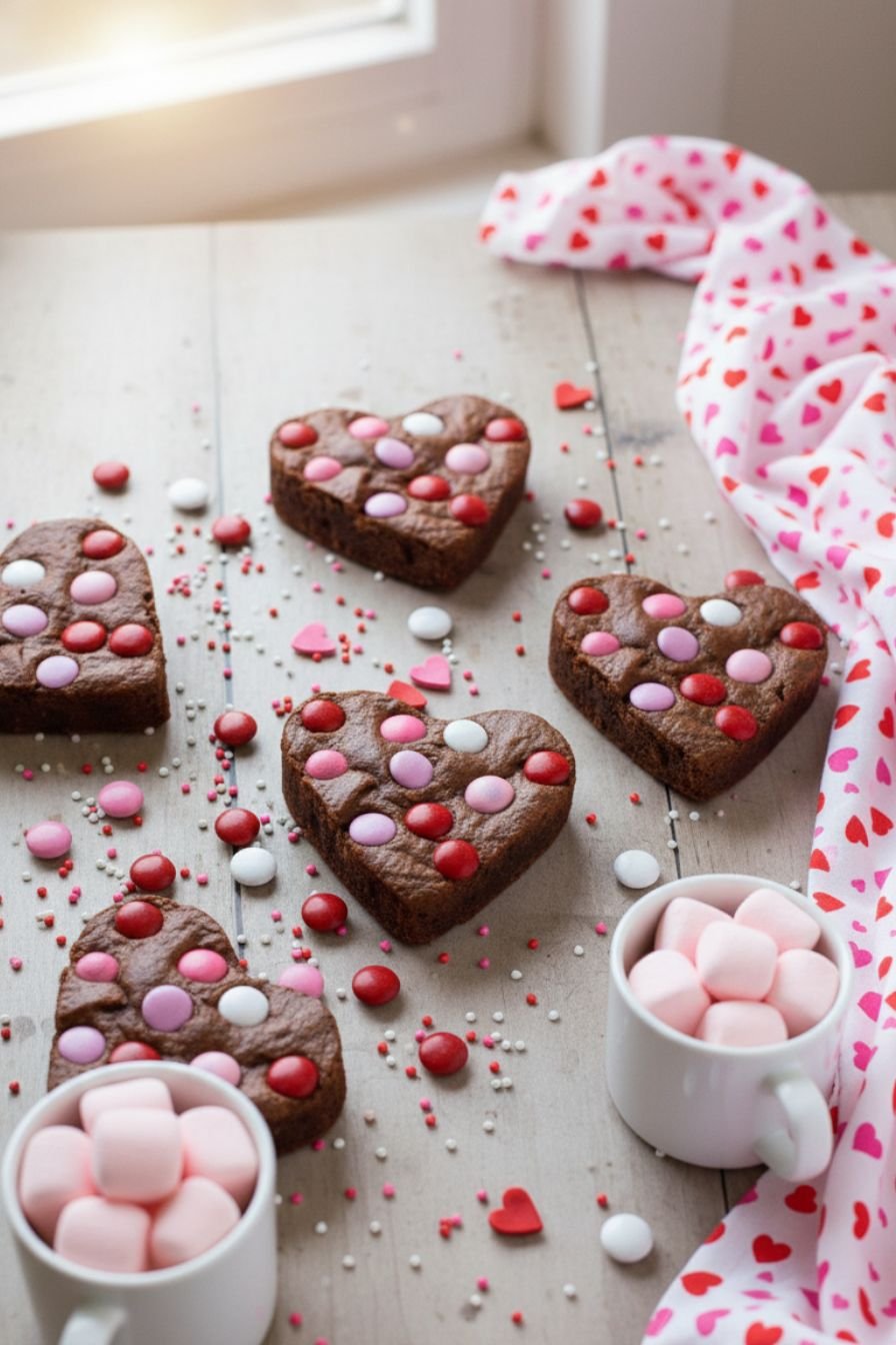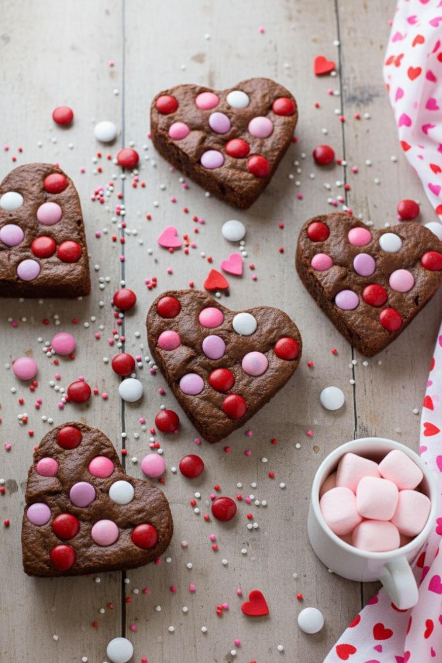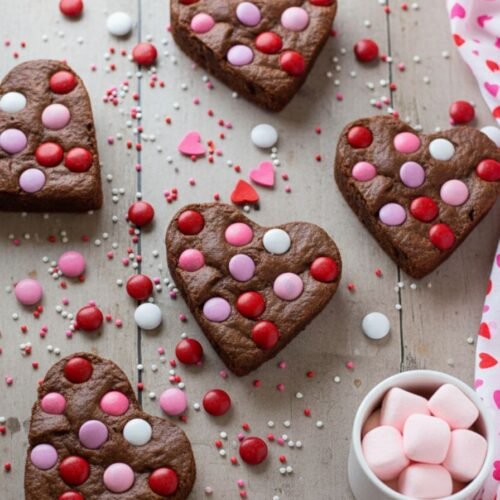 - Top with Valentine sprinkles. For festive shapes, use a heart-shaped cookie cutter to cut out brownies.