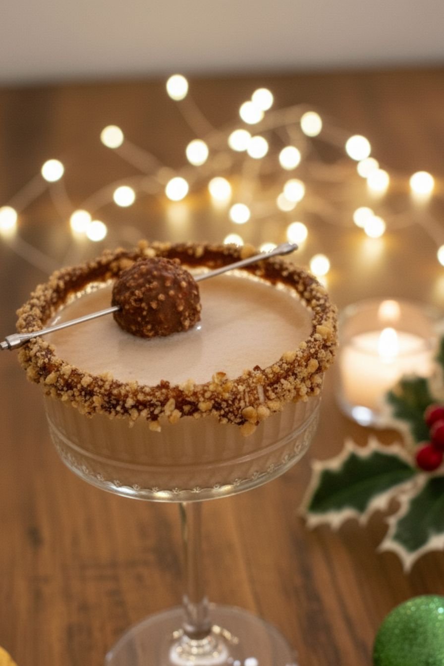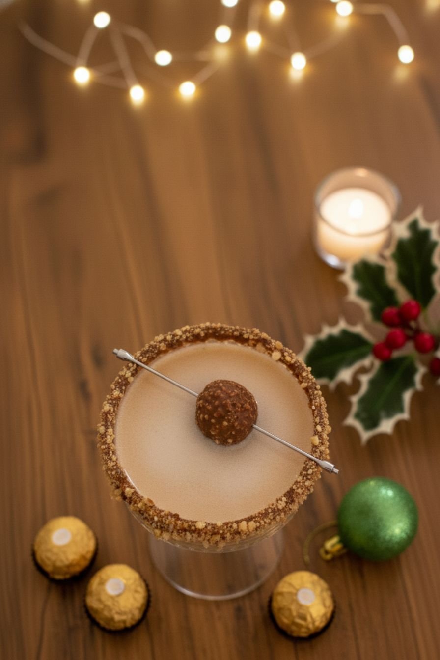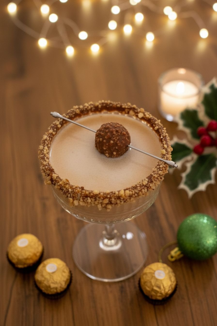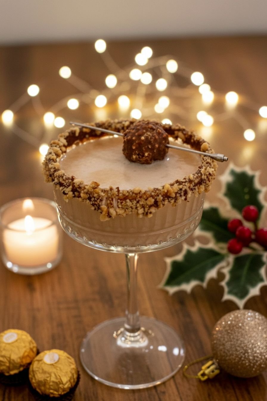 - Prepare the glass: Rim a chilled martini or coupe glass with chocolate syrup and dip in crushed Ferrero Rocher or cocoa powder.