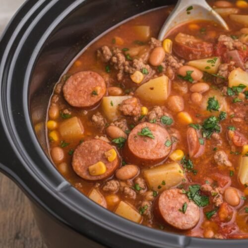Nothing screams comfort like a warm, hearty bowl of cowboy stew. This is one of those comfort food recipes that sticks to your ribs and fills your kitchen with the nostalgic aroma of home-cooked goodness. Between the sausage, ground beef, potatoes, and veggies, every spoonful is deeply satisfying.