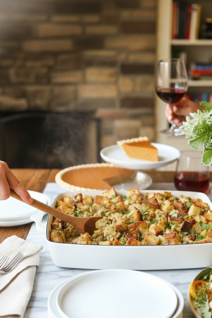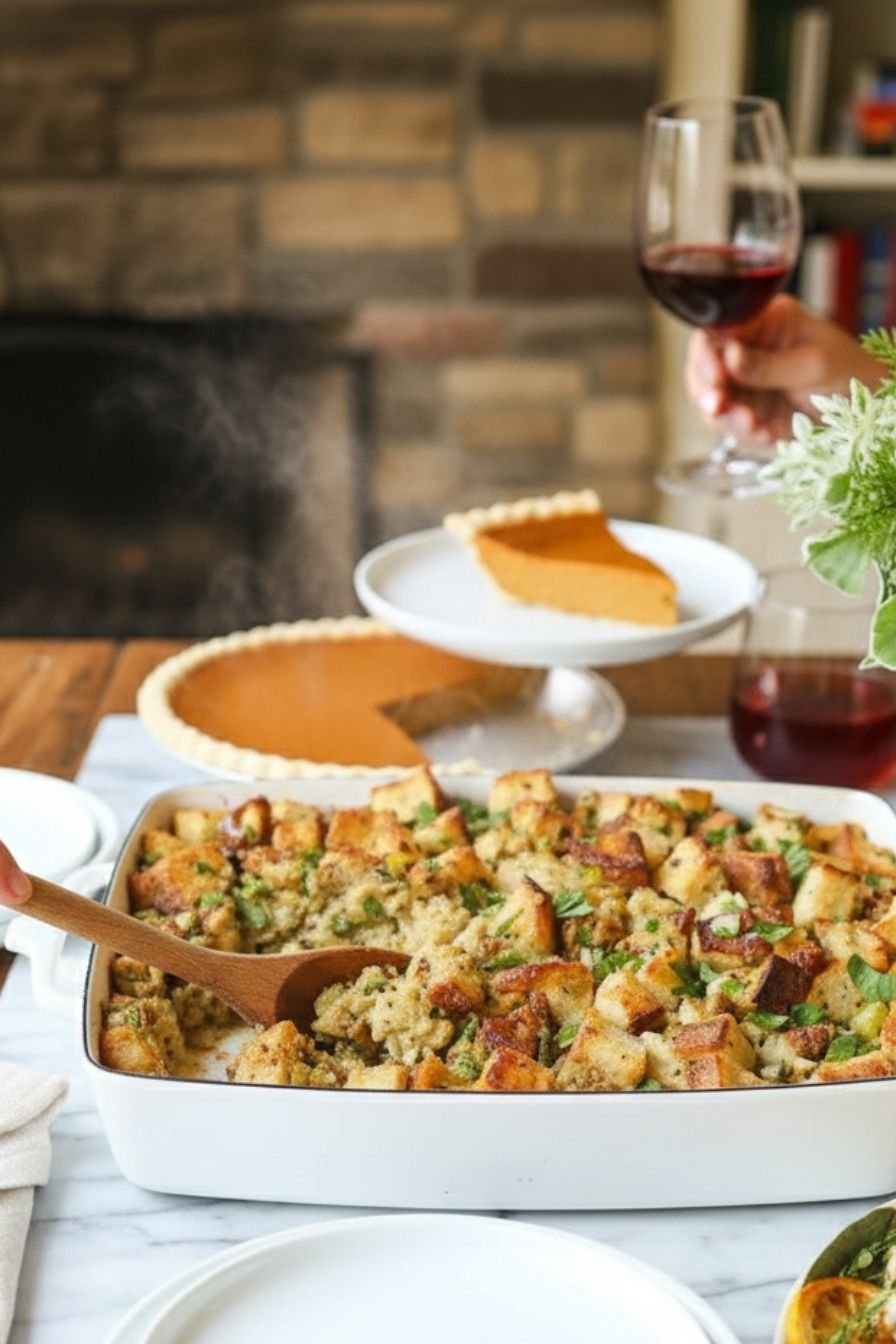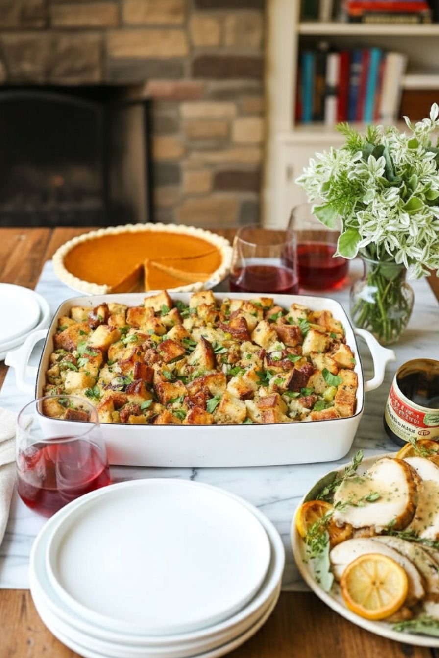 Dry your bread cubes overnight for the best texture. Preferably use fresh herbs for a brighter flavor. If your mixture feels too dry, just add a bit more stock until it’s nicely moistened. This dish pairs perfectly with turkey, roast chicken, or even as a standalone comfort bite during the holidays.